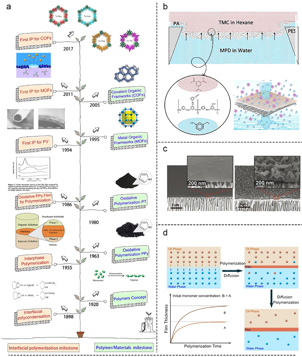 图2展示了界面聚合(IP)相关研究的关键发展与膜结构特征:(a)为IP技术的重要发展历程时间轴;(b)展示了三羧氯(TMC)与间苯二胺(MPD)之间的典型IP反应过程,插图进一步说明了膜的形成机制与渗透性能;(c)为不同形貌的纳米膜截面扫描电镜(SEM)图像,左为平整膜,右为褶皱膜;(d)为在不同单体浓度下,膜厚度随IP反应时间变化的关系图。