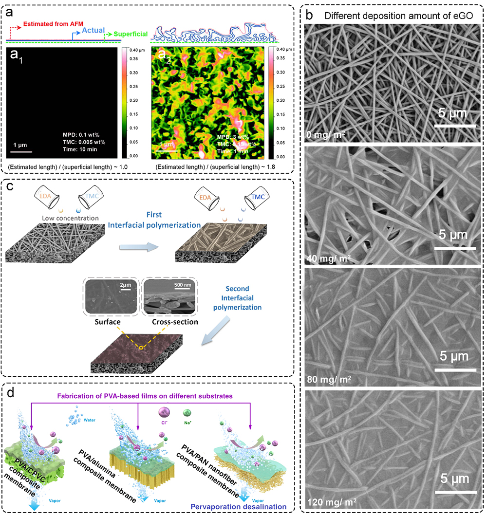 图5展示了选择性层结构调控与复合膜构建策略:(a)为原子力显微镜图像,分别显示了平整纳米膜(a1)与褶皱纳米膜(a2)的实际长度与表观长度对比;(b)为不同eGO沉积量(0、40、80 和 120 mg·m²)下PAN纳米纤维支撑层的表面形貌;(c)为通过双选择性层路径构建复合膜的制备流程图;(d)为采用不同多孔支撑层构建的PVA基TFC膜结构示意图。