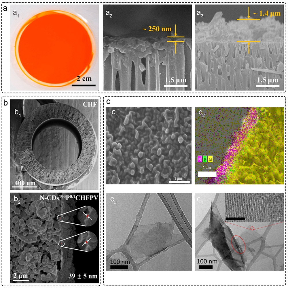 图6展示了基于新型功能材料构建的IP膜结构与表征结果:(a)为TpHZ/AAO膜的实物图像,其中(a1)为整体膜,(a2)与(a3)分别为不同TpHZ含量(0.5和1.5)下的膜外观;(b)为CHF支撑层(b1)及通过IP过程引入氮掺杂碳量子点(N-CDs)后的选择性层(b2)的截面SEM图;(c)为AEL纳米片/聚酰胺复合膜的截面结构(c),其(c1–c2)为EDS元素分布图,(c3–c4)为剥离态AEL纳米片的TEM图像。