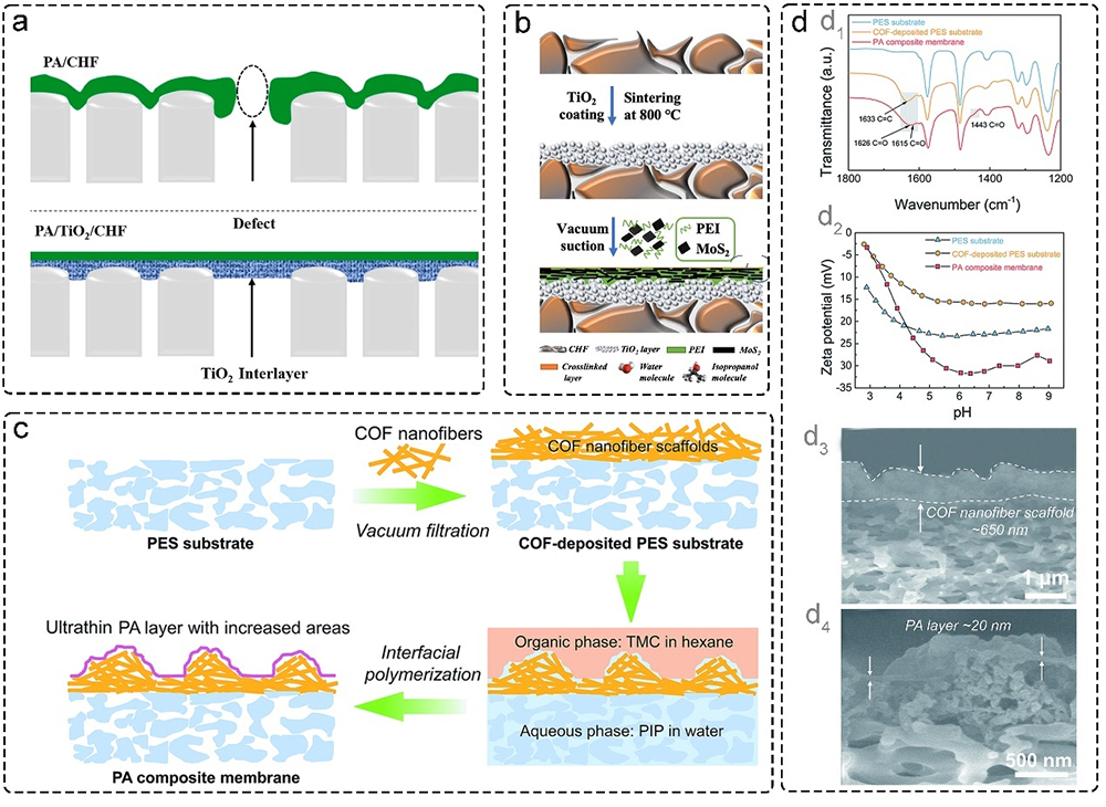 图7展示了多种中间层材料在不同支撑层上的构筑与膜性能表征:(a)为TiO₂中间层在CHF支撑层上的分布情况;(b)为MoS₂中间层在CHF支撑层上的形貌;(c)为COF中间层在PES支撑层上的结构示意;(d)包含不同膜的(d1-d2) ATR-FTIR光谱与Zeta电位测试结果,以及(d3-d4) 聚酰胺复合膜的截面结构图像。