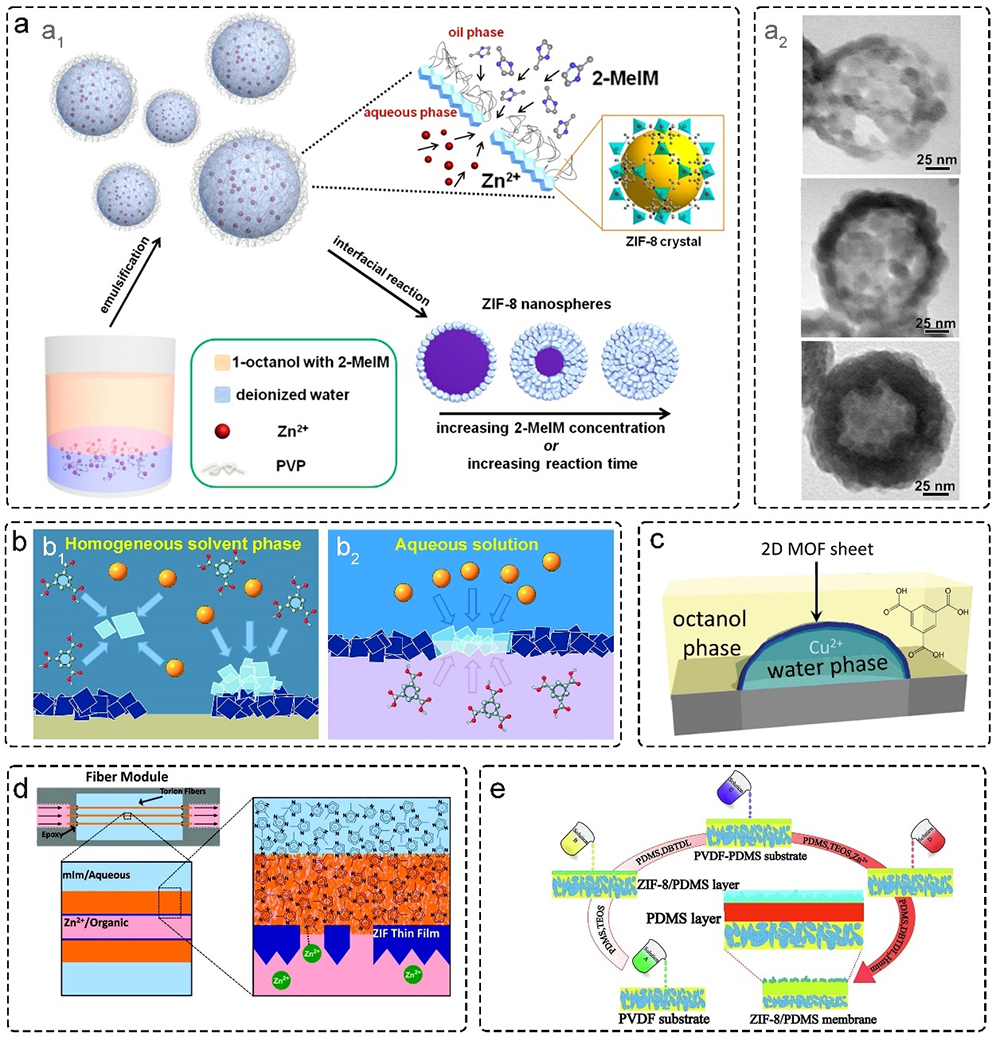 图8展示了基于MOF材料的界面聚合过程与膜构筑策略:(a1)为中空ZIF-8纳米球的结构图,(a2)为在不同IP单体浓度下的对应TEM图像;(b)为MOF膜合成的多种策略,其中(b1)为MOF层在基底上的沉积过程,(b2)展示了MOF层参与的界面聚合过程,图中橙色球表示金属离子,蓝色八面体代表MOF晶体,深蓝色八面体为已形成结构;(c)为二维MOF片层的生长示意图;(d)展示了中空纤维中MOF膜的界面微流控构建方法;(e)为ZIF-8@MMM膜的多种合成策略示意图。