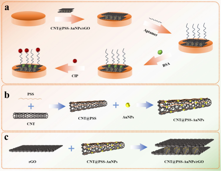 图2. CNT@PSS-AuNPs/rGO/SPCE的环丙沙星检测原理示意图。