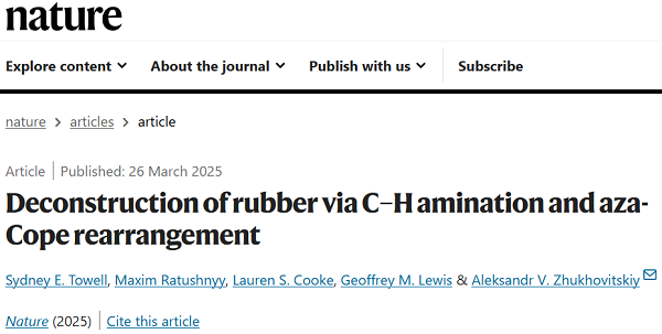 原文详情:Deconstruction of rubber via C–H amination and aza-Cope rearrangement (Nature 2025, DOI: 10.1038/s41586-025-08716-6)