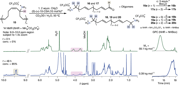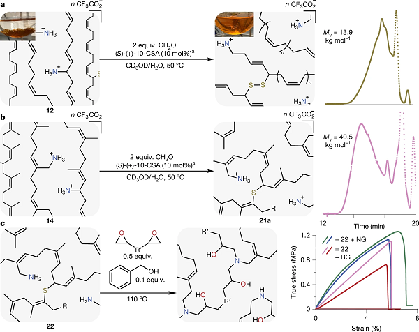 近期,美国北卡罗来纳大学教堂山分校Aleksandr V. Zhukhovitskiy教授团队在Nature上发表了题为“Deconstruction of rubber via C–H amination and aza-Cope rearrangement”的论文,报道了一种应用聚合物的 C-H 氨化和骨架重排将轮胎中二烯聚合物解构为环氧树脂的前体的策略。具体地,研究人员使用一种硫二亚胺试剂试剂,可使二烯聚合物和橡胶的烯丙基胺化率高达 35%。然后应用阳离子 2-aza-Cope 重排(ACR)来解构胺化二烯聚合物。实验结果表明,在一个模型体系中分子量从 58,100 g/mol 降低到大约 400 g/mol,废弃轮胎橡胶可以在6小时内转化为可溶性的胺功能化聚合物,这些聚合物可以用于制备与商业双酚A衍生环氧树脂具有相似刚性的环氧热固性材料。总之,这项研究成果证明了 C-H 氨化和骨架重排技术在实现废弃化学品回收利用方面的强大功能。