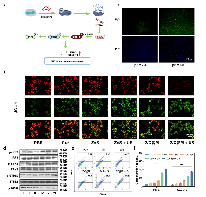 2. 同时压电催化产生的大量活性氧与姜黄素协同作用,诱导肿瘤细胞线粒体损伤,线粒体DNA释放,激活cGAS-STING信号通路。此外,肿瘤微环境的微酸特性促进Zn2+的释放,增强了cGAS对双链DNA的敏感性,从而强化cGAS-STING信号转导,提升抗肿瘤免疫疗效,实现了压电催化与免疫的协同治疗。