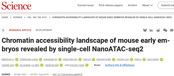 原文详情:Chromatin accessibility landscape of mouse early embryos revealed by single-cell NanoATAC-seq2 (Science 2025, 387, DOI: 10.1126/science.adp4319)