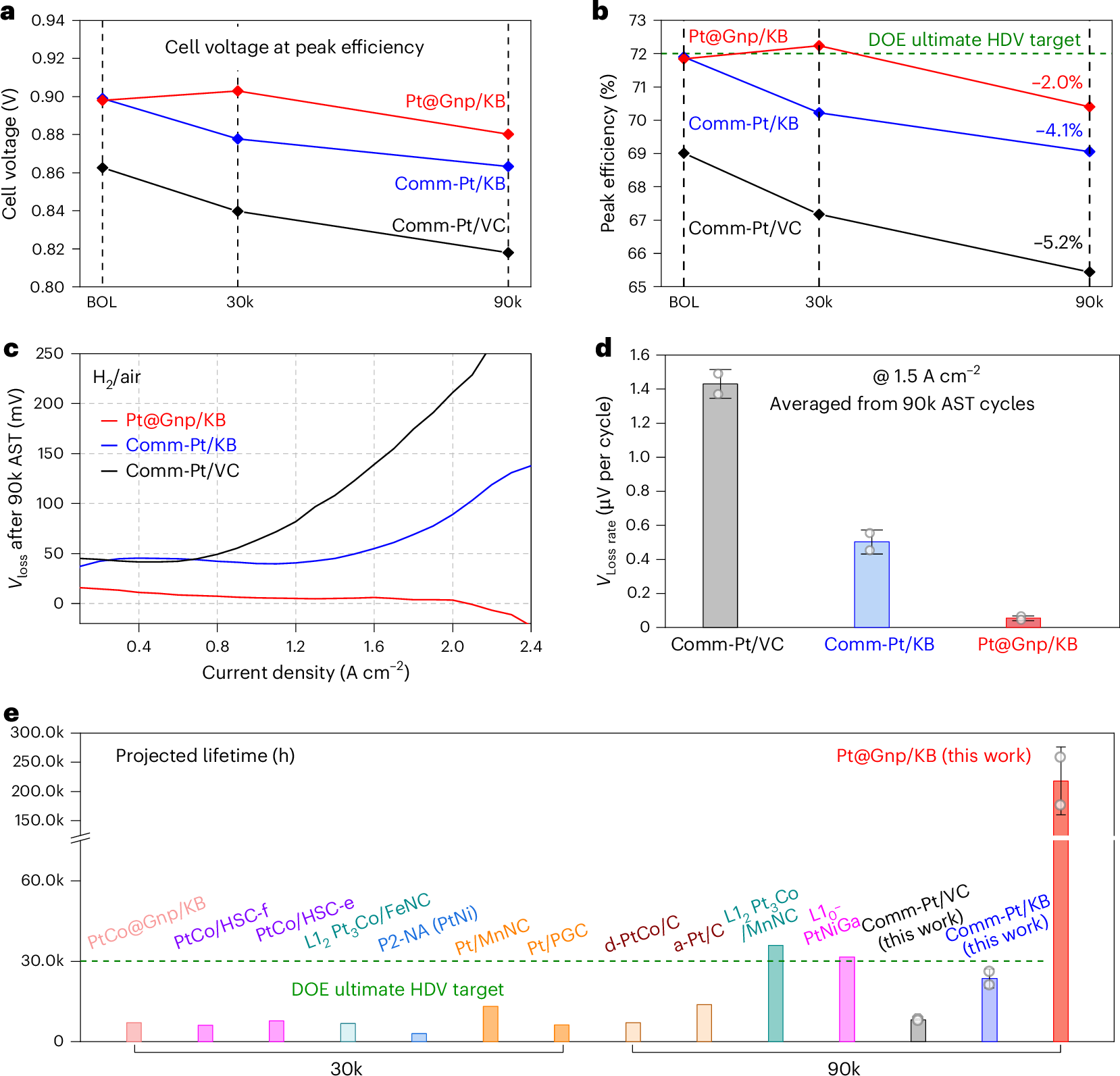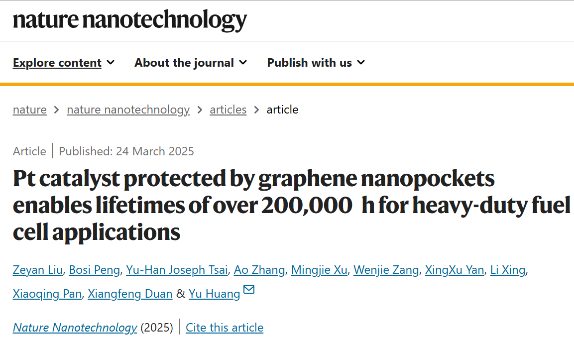 针对以上问题,加州大学洛杉矶分校黄昱教授课题组报道了一种基于Ketjenblack碳载体的石墨烯纳米袋保护、孔限域且电化学可及的Pt纳米催化剂(Pt@Gnp/KB)的设计。由该纳米催化剂制备的膜电极组件(MEA)表现出0.74 A mgPt−1的初始质量活性、1.08 W cm−2的高额定功率密度,以及经过9万次剧烈方波循环后仅1.1%的极低功率损失。该催化剂卓越的活性和耐久性使得燃料电池寿命超过20万小时,峰值效率达71.9%,远超美国能源部(DOE)设定的2050年重型车辆终极目标。该催化剂通过抑制Pt颗粒聚集、溶解,显著提升了燃料电池的长期稳定性,为重型车辆应用提供了极具吸引力的解决方案。相关研究成果以“Pt catalyst protected by graphene nanopockets enables lifetimes of over 200,000 h for heavy-duty fuel cell applications”为题,发表在最新一期的Nature Nanotechnology上。