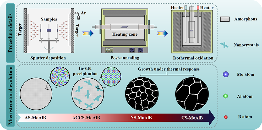 非晶(AS)材料由于原子长程无序排列而缺乏晶体学特征,展现出对腐蚀或侵蚀环境的独特抵抗能力。更为关键的是,这类热力学非平衡结构在高温条件下会发生动态演变:首先转化为纳米晶结构(NS),最终形成粗晶组织(CS)。伴随该相变过程产生的晶体缺陷动态调控现象(初期增加而后减少),为氧化物形成元素提供了优化的迁移通道,这有助于实现α-Al2O3保护层的快形成和慢生长特征,从而有望改善MoAlB的高温抗氧化性能。但需特别指出的是,均质非晶结构中原子单元的同步氧化将对MoAlB产生负面影响,因为挥发性氧化物会严重破坏α-Al2O3保护层的连续性和致密性。