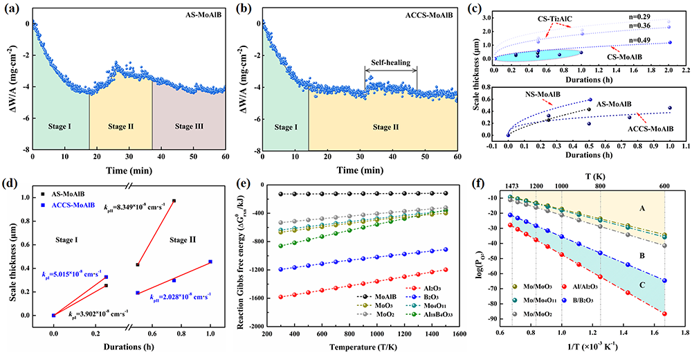 在高温防护体系中,α-Al2O3凭借其超低氧渗透率及本征热稳定性,显著优于Cr2O3和SiO2,成为长时热防护的理想屏障层,这一特征突显了α-Al2O3形成物在极端环境中的独特优势。在此背景下,具有正交结构的MoAlB(222型MAB相)材料因其独特的各向异性键合特征,通过选择性氧化机制展现出优异的高温抗氧化性能,已被视为先进热防护领域极具发展前景的候选材料。然而,尽管学界普遍认同保护性α-Al2O3是MoAlB的宏观氧化机制,但其在1200℃等温氧化行为仍存在显著争议。此外,钼和硼原子参与形成的挥发性氧化物显著加剧了MoAlB材料的高温降解进程。