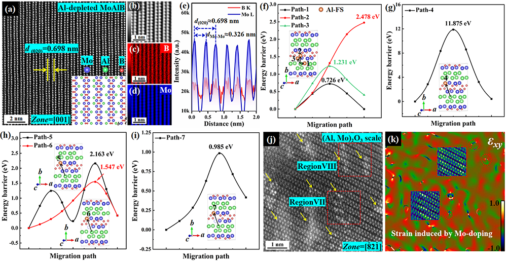 图6 (a-e) 非化学计量MoAlB基质的HAADF图与EDS结果,(f-i) Al空位扩散能垒图,(j) α-Al2O3保护层的HAADF图以及(k)几何相位分析.