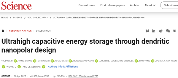 原文详情:Ultrahigh capacitive energy storage through dendritic nanopolar design (Science 2025, 388, 211-216)
