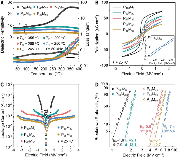 图3 PM薄膜的介电常数、铁电性、漏电流密度和击穿强度 © 2025 AAAS