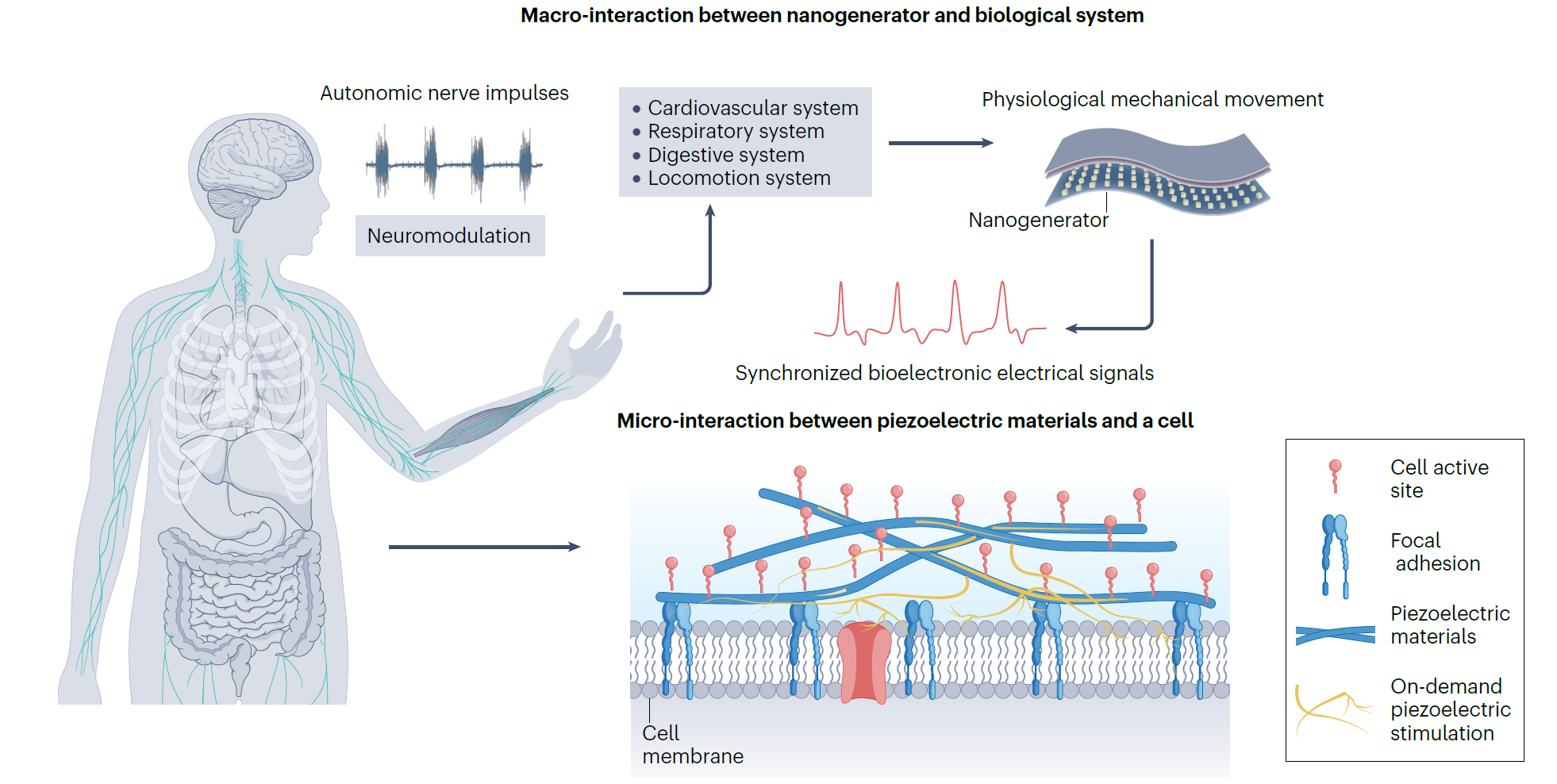 在器官尺度上,纳米发电机(涵盖压电、摩擦、磁弹以及压电离子等多种类型)构建了一种宏观的机电转换平台。该平台能够将自主神经系统调控的器官节律性运动转化为同步的电脉冲,进而直接刺激生物系统的靶向部位。从直观角度来看,由器官运动驱动纳米发电机所产生的电信号被视为一种自供电的刺激方案,然而它们所具备的生物反馈功能往往被人们所忽视。实际上,生物力学节律(例如心跳、呼吸、消化器官蠕动、肌肉变形以及关节运动等)蕴含着大量源自自主神经系统的生理信息,尤其是与实时的生理或病理状况密切相关。因此,当受到这些生物力学运动的驱动时,纳米发电机产生的电信号能够与内源性神经响应的微妙变化保持实时同步。此外,本团队近年来的一些研究表明,呼吸运动驱动的纳米发电机可以产生与迷走神经脉冲峰值包络高度同步的仿生电信号,从而获得了自体神经信号的内在生物反馈特征。本文探讨了利用纳米发电机产生的自持续电刺激的治疗应用,并着重强调了电刺激信号在治疗不同器官/组织疾病时的特异性。这些治疗应用可以划分为两种类型:直接治疗和间接治疗。