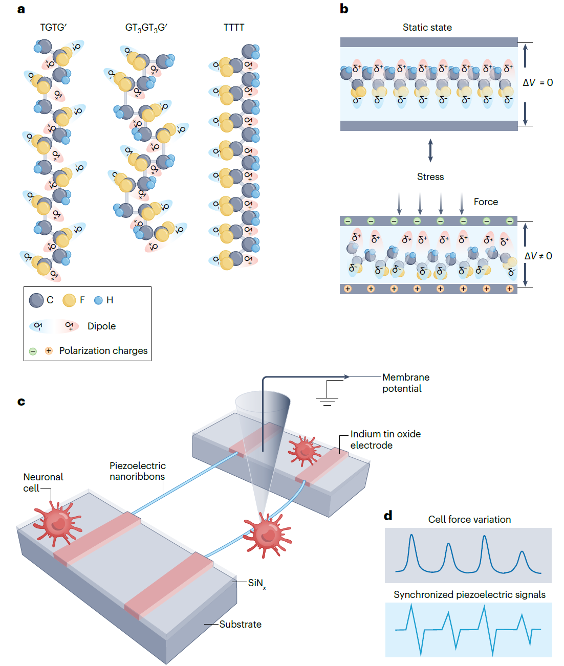 由此产生的压电刺激能够可控地开启或关闭电敏感的门控离子通道(如钙离子、钠离子、钾离子等),诱导细胞骨架运动,并根据需要加速可溶性因子分泌及基质沉积,进而激活相应基因通路,自主调节从细胞周期、迁移、增殖和分化到神经传导、肌肉收缩、胚胎发生和组织再生等一系列生物过程。细胞与压电材料之间的双向相互作用在帮助细胞迅速适应动态微环境以及避免早期电刺激对细胞扩散和粘附的不利影响方面发挥着关键作用。最为重要的是,细胞牵引力触发的按需电刺激提供了一种生物反馈功能,能够有效消除棘手的电刺激诱导生物惯性,而传统连续、恒定振幅的电刺激通常难以实现这一效果。