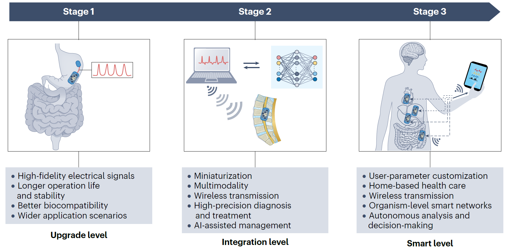 自持续生物电子设备的出现标志着可穿戴和可植入生物医学设备领域取得了重大进步,并将引领电子医疗的新时代。然而,诸如稳定性、耐用性、准确性和高侵入性等关键挑战仍需进一步改进,以满足临床需求。此外,使用可生物降解的电活性材料替代组件中传统使用的不可降解材料(包括传感层、电极、电线和封装层)对于避免二次手术切除以及最大限度地减少植入的自持续生物电子系统的免疫反应至关重要。作者对自持续生物电子学的未来轨迹进行了批判性分析和预测,为设计下一代生物医学设备提供了指导(见图3)。目前,自持续生物电子设备正处于性能改进阶段,仍然依赖于导线传输电信号,许多技术进步都集中在提高设备性能上,特别是电信号保真度和长期稳定性。接下来,通过最小化设备尺寸、设计多模态以及应用人工智能(AI)进行管理,自持续生物电子学将处于集成水平。最终,随着在人体周身上建立器官规模的智能自持续生物电子网络,可以实现准确的用户参数定制、家庭医疗以及自主分析和决策,从而达到智能化水平。