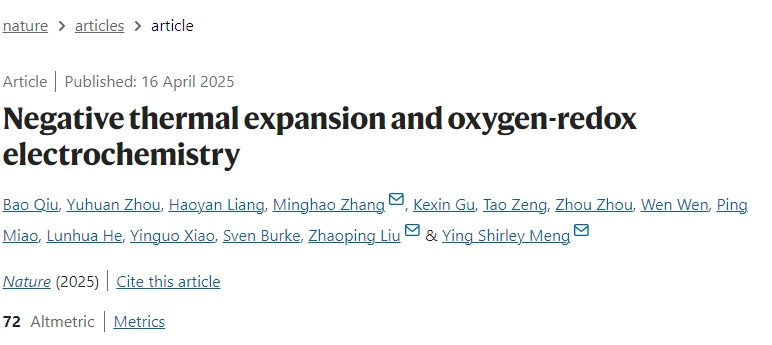1. 发现氧氧化还原(OR)材料中的负热膨胀(NTE)现象及其机制。反常热力学行为:首次在富锂锰基正极材料中观察到晶格随温度升高而收缩的负热膨胀现象(NTE系数达−14.4×10⁻⁶ °C⁻¹),突破了传统Grüneisen理论对固体热膨胀的解释框架。动态无序-有序转变机制:提出NTE源于材料内部热驱动的结构无序向有序转变,揭示了氧活性与晶格稳定性之间的动态平衡对热力学行为的调控作用。
