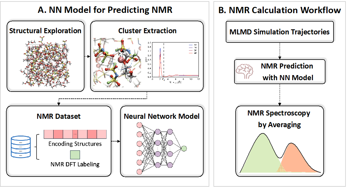 图1: 预测核磁共振(NMR)谱的流程。(左)训练神经网络(NN)模型的方法。捕捉不同浓度下的各种结构,并提取Li⁺的溶剂化结构。随后,使用描述符对结构进行编码,并计算其相应的化学位移。(右)NMR谱预测流程。使用机器学习分子动力学(MLMD)模拟生成轨迹,然后利用所得到的核磁共振预测神经网络模型来获取核磁共振光谱。