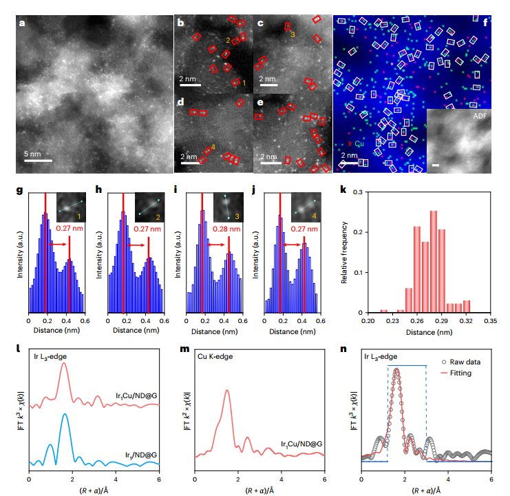 研究人员采用像差校正的高角度环形暗场扫描透射电子显微镜(HAADF-STEM)表征了催化剂的结构。Ir1–Cu1原子对在ND@G表面,以红色矩形突出显示,研究人员命名为Ir1Cu/ND@G。大多数Ir原子与Cu原子相邻,形成Ir1–Cu1原子对,而多余的Cu以孤立物种或非常小簇的形式高度分散在碳表面上。能量色散X射线光谱(EDX)分析为Ir1Cu/ND@G中的双原子结构提供了强有力的证据。Ir和Cu原子之间的距离平均为0.276±0.016 nm,表明存在几何结构的Ir1–Cu1原子对。