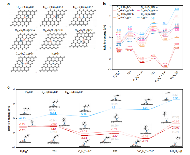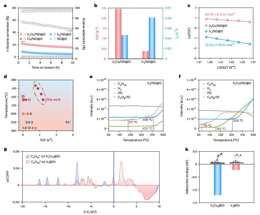 在后续的研究中,研究人员相继开展了反应动力学实验、程序控温表面反应以及DFT计算实验,实验与计算数据表明:该催化剂具有的双原子结构能够大幅降低反应的空间位阻,而且Cu原子还能够调控活性中心Ir的表面电子态,这使得Ir原子呈现出富电子特性,从而更加有利于与C原子键合,从而促进丁烷及其中间体的吸附。