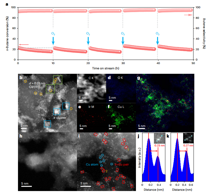 该研究通过构建Ir1-Cu1双原子催化剂,实现了丁烷低温高效脱氢制备丁烯,并且有效攻克了原子级分散金属催化剂在高温反应中易团聚、易失活的技术难题。以“A highly efficient and regenerable Ir1–Cu1 dual-atom catalyst for low-temperature alkane dehydrogenation”为题发表在国际顶级期刊Nature Catalysis上,引起了相关领域研究人员的热议。