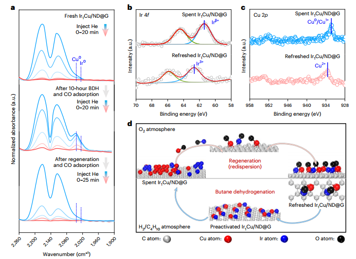 研究人员还研究了Ir1Cu/ND@G催化剂的再生能力。研究团队对反应10 h后的双原子催化剂进行氧化再生处理,分析结果表明,催化剂在每个循环后都显示出丁烷转化率和丁烯选择性的完全恢复。在所有五个循环中,性能均恢复到丁烷转化率和丁烯选择性的基线水平,这体现出Ir1Cu/ND@G具有较高的再生能力。再生过程中,Ir和Cu组分可由团簇状态重新分散为原子状态(聚集-再分散),并重新实现 Ir1-Cu1双原子结构的再生。再生处理过程还能有效除去积碳,重新构建了催化剂的几何结构和微环境,这一过程还有效延长了催化剂的使用寿命。