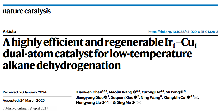 文献链接:A highly efficient and regenerable Ir1–Cu1 dual-atom catalyst for low-temperature alkane dehydrogenation,2025,https://doi.org/10.1038/s41929-025-01328-3)