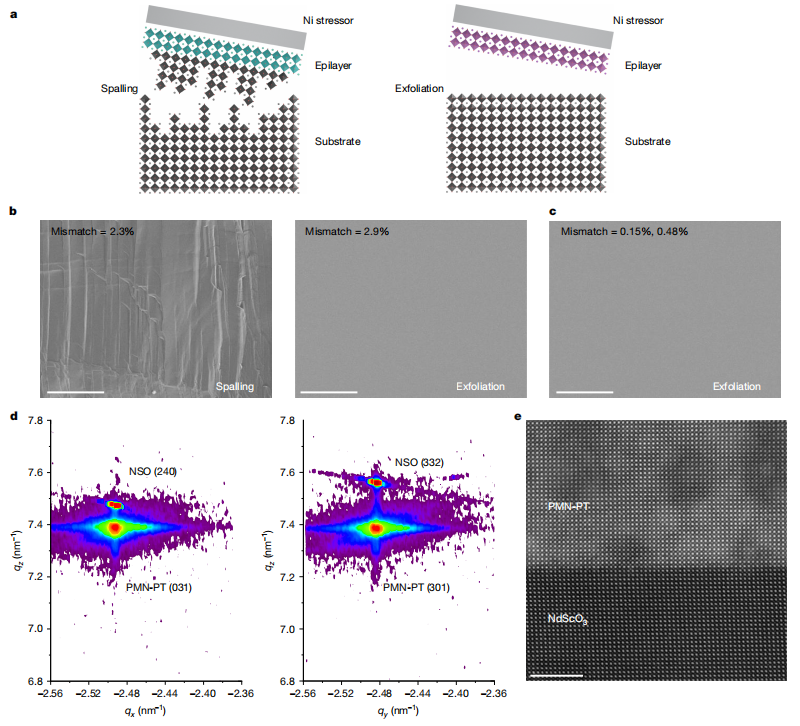 图1 ALO剥离机制研究。(a)剥离过程的两种模式(Spalling与Exfoliation)示意图。(b)BTO(左)与PMN-PT(右)薄膜从STO衬底剥离的平面扫描电镜(SEM)图像。BTO剥离时伴随衬底碎裂(非均匀),而PMN-PT界面剥离均匀。(c)晶格匹配的NSO衬底上PMN-PT薄膜的剥离SEM图像,显示界面选择性剥离。(d)不同面内方向的倒易空间映射(RSM),证明PMN-PT与NSO的共格外延关系。(e)PMN-PT/NSO异质结构的横截面透射电镜(TEM)图像,展示外延界面原子排列。© 2023 Springer Nature