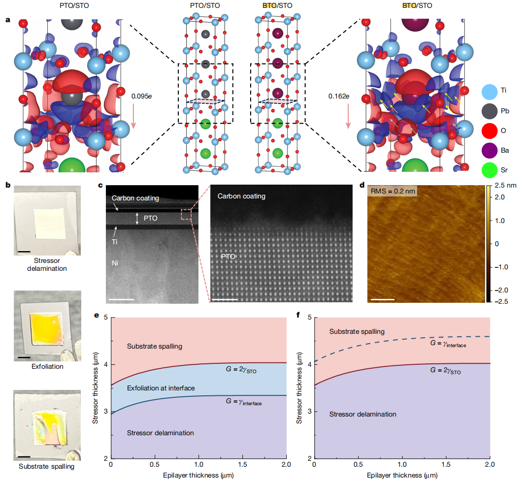 图2铅诱导界面弱化的理论与实验验证。(a)PTO/STO(左)与BTO/STO(右)界面的电荷转移DFT模拟(蓝色:电荷流失,红色:电荷富集)。(b)PTO薄膜从STO衬底剥离的三种裂纹模式:应力层脱层(上)、界面剥离(中)、衬底碎裂(下)。(c)剥离后STO衬底表面的原子力显微镜(AFM)图像,均方根粗糙度(RMS)为0.51 nm。(d)剥离PTO薄膜的电子背散射衍射(EBSD)取向分布图(上)与晶向偏差统计(下),峰值接近0°,半高宽0.38°。(e)剥离窗口的理论预测:仅当界面能低于薄膜和衬底表面能时,可实现精准剥离(PTO/STO案例)。(f)BTO/STO因界面能高,仅能通过衬底碎裂或应力层脱层剥离。© 2023 Springer Nature