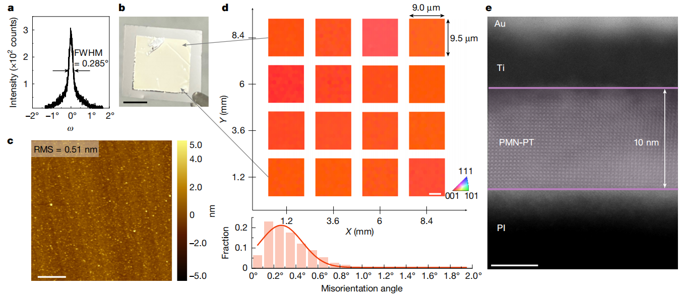 图3 ALO技术的大规模超薄膜制备优势。(a)10 nm厚PMN-PT薄膜的XRD摇摆曲线,半高宽0.28°,证明高结晶质量。(b)剥离的10×10 mm²超薄膜光学显微图像。(c)剥离后STO衬底的AFM表面形貌(RMS=0.51 nm)。(d)薄膜全域EBSD取向图(上)与晶向偏差分布(下),半高宽0.38°。(e)转移至柔性衬底的10 nm PMN-PT薄膜横截面TEM图像,显示单晶结构保留。© 2023 Springer Nature