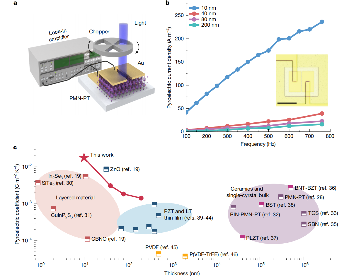 图4 超薄膜热释电性能表征。(a)热释电器件测试光路示意图(锁相放大与激光调制)。(b)不同厚度PMN-PT薄膜的热释电电流密度随调制频率变化,10 nm薄膜性能最优。(c)10 nm薄膜热释电系数,与经典材料(如PZT、LiTaO₃)对比,提升2个数量级。© 2023 Springer Nature
