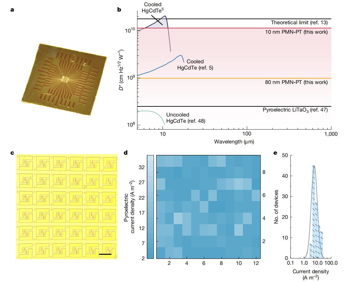 图5无冷却红外成像应用潜力。(a)热释电器件阵列示意图。(b)探测器比探测率,随波长变化,10 nm薄膜性能接近理论极限,覆盖全远红外谱(>15 μm)。(c)80 nm厚薄膜器件阵列光学图像(良率100%)。(d)108个器件的热释电电流密度分布图(颜色代表响应强度)。(e)器件电流密度统计直方图,显示高度一致性。© 2023 Springer Nature