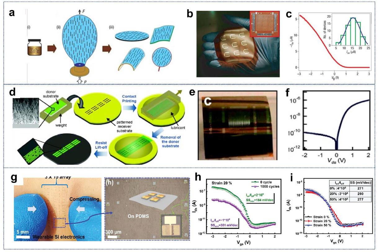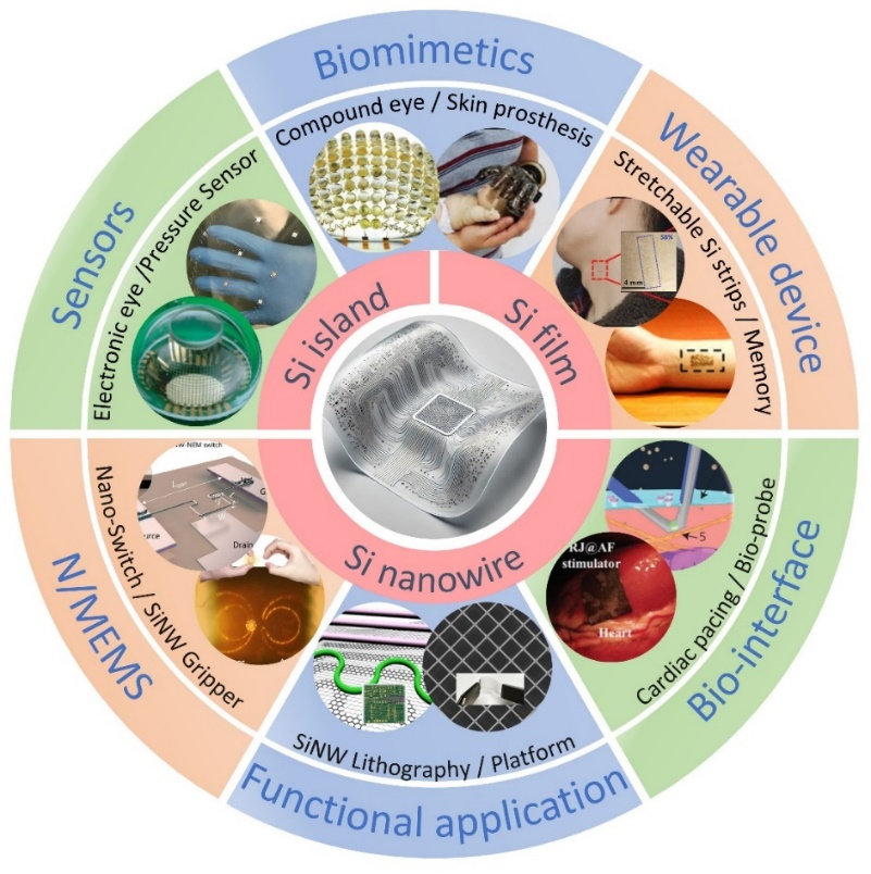 柔性电子器件是一类能够在机械变形(如弯曲、拉伸和折叠)条件下工作的电子设备,在可穿戴设备、电子皮肤、智能传感以及脑机接口等领域中扮演着重要角色。尽管晶体硅(c-Si)作为最成熟且可靠的高性能电子材料,广泛应用于高性能电子器件中,但其固有的脆性和刚性限制了在柔性电子领域的应用。为了克服这一挑战,研究人员利用形貌工程或结构设计的方法,从“硅岛”设计(3D体硅)到硅薄膜蚀刻(2D硅薄膜)到硅纳米线(1D)三个层次赋予硅材料及其器件柔性或可拉伸性。值得注意的是,面内固-液-固(in-plane solid-liquid-solid, IPSLS)引导可编程硅纳米线(SiNWs)生长的策略为制备具有弹性特性的SiNWs阵列提供了基础,被视为获得超柔性和超可拉伸硅材料的极具潜力的方式。进一步,通过将柔性硅材料与柔性电子学相结合,为开发高性能柔性电子器件开辟了新的路径。