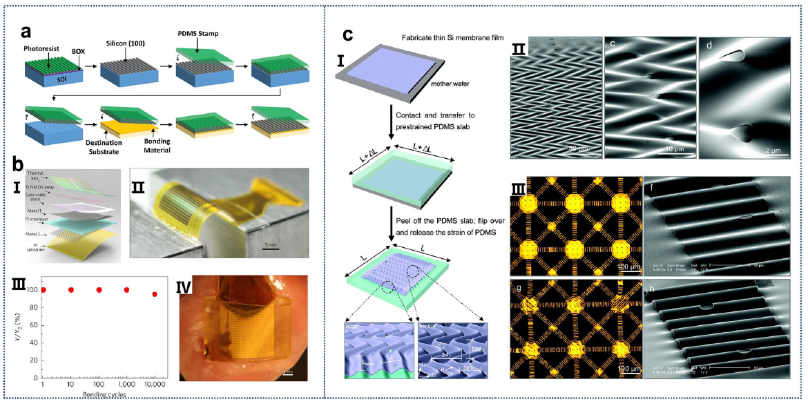 图3 通过减薄晶硅薄膜并采用折叠或波状结构设计构建柔性薄膜