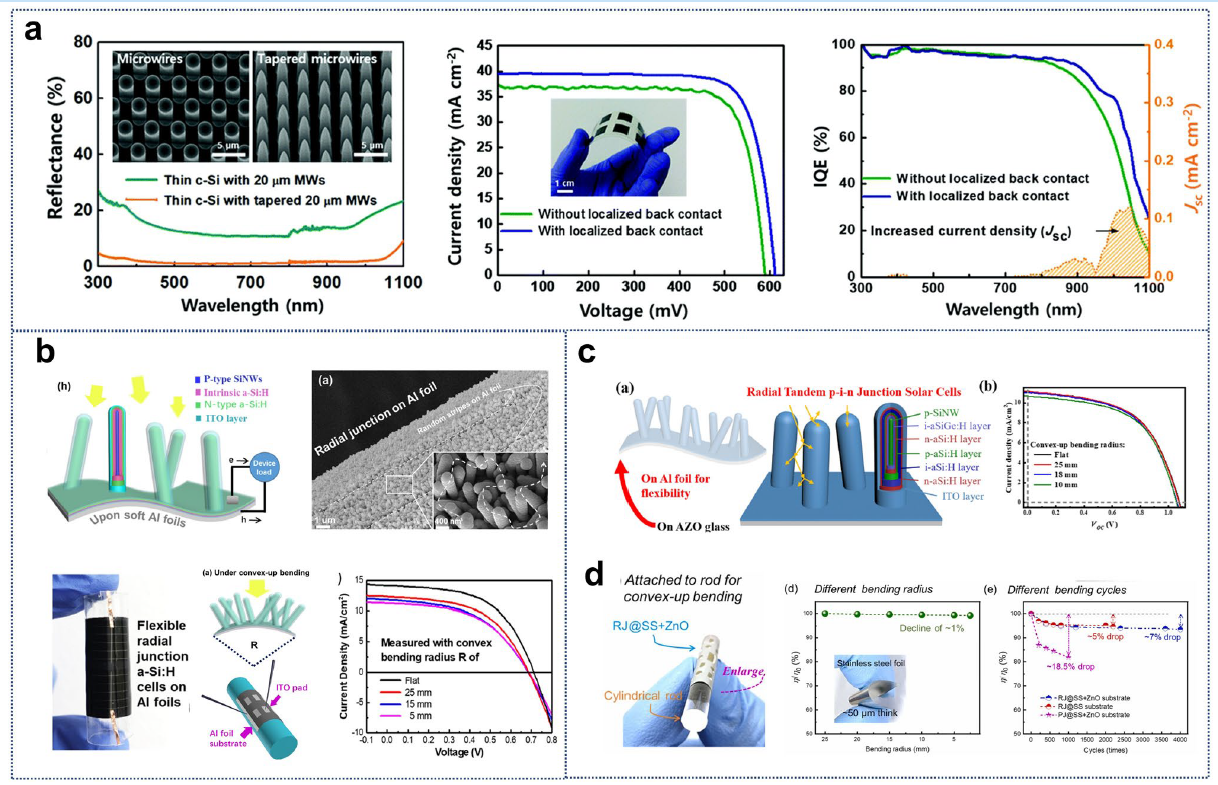 - 论文从柔性衬底上的三维块体硬岛(图2)到二维柔性薄膜(图3)再到一维纳米线(图4和图5)三个层次系统回顾了晶硅柔性化的关键策略。