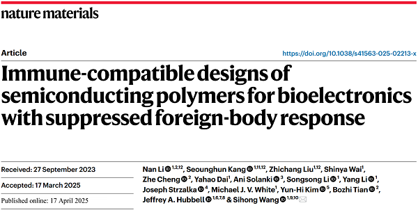 原文详情:Immune-compatible designs of semiconducting polymers for bioelectronics with suppressed foreign-body response (Nat. Mater. 2025, DOI: 10.1038/s41563-025-02213-x)