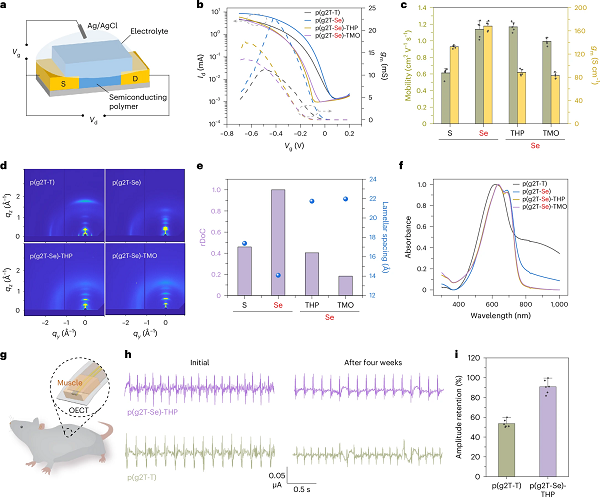 图5 免疫兼容半导体聚合物的OECT表征和植入应用 © 2025 Springer Nature