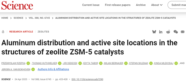 原文详情:Aluminum distribution and active site locations in the structures of zeolite ZSM-5 catalysts (Science 2025, 388,423-428, DOI: 10.1126/science.ads7290)