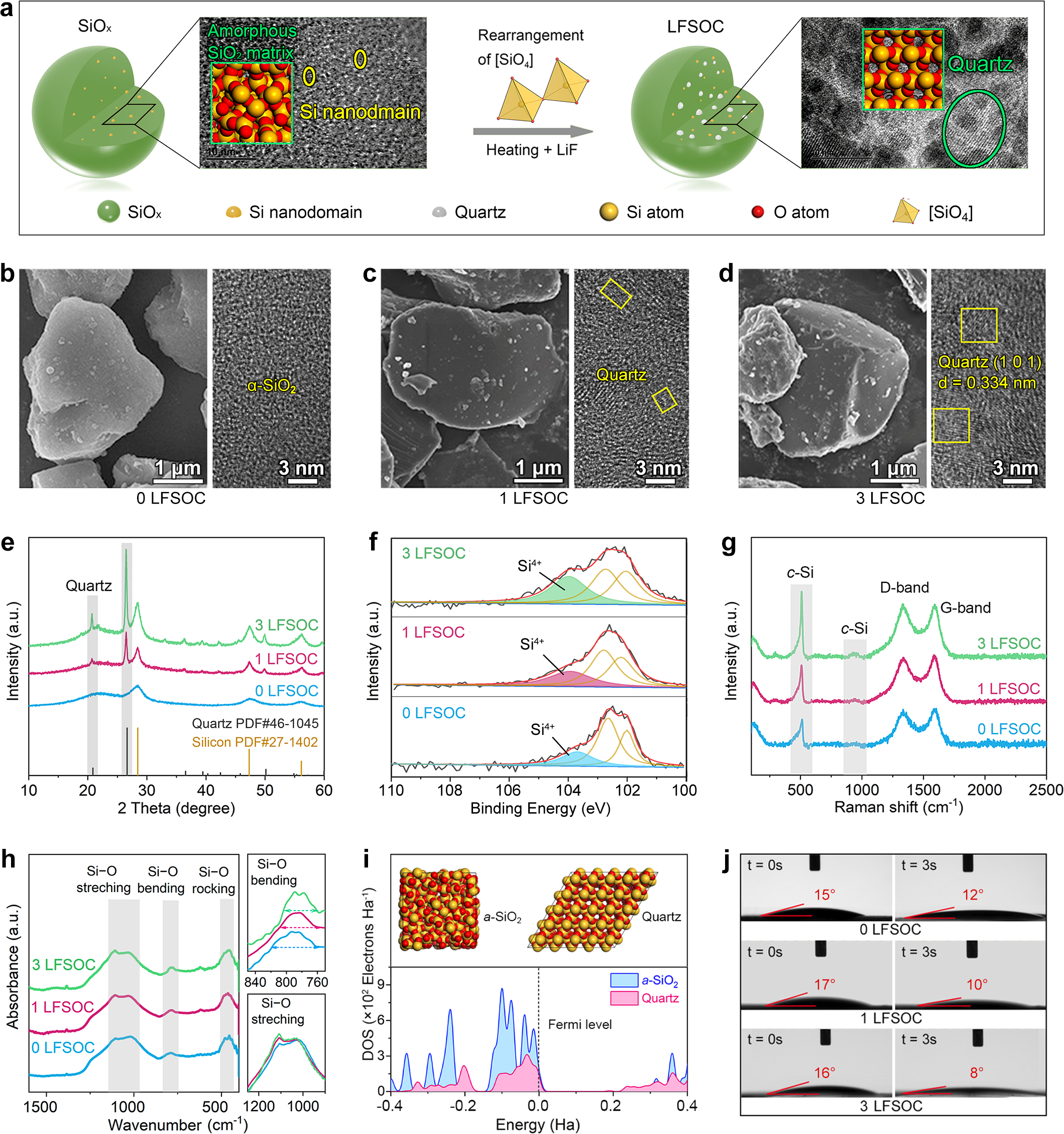 研究通过引入微量LiF助熔剂(如1 wt%),在900°C下诱导SiOx局部结晶形成类石英结构。该结构不仅本身几乎不与锂反应,还能稳定SiOx中的氧元素,降低不可逆锂耗。更重要的是,石英晶体像铆钉一样分布于材料内部,有效缓解体积应力,抑制开裂,是负极材料的“稳定基石”。 XRD & Raman显示:石英与晶化Si的形成程度随LiF添加量增加而增强;FTIR:Si-O键局域结构发生改变,形成更有序的[SiO4]网络;HRTEM:1 LFSOC中可见石英和Si纳米晶域共存,构建稳定复合骨架。