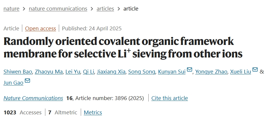 某些生物通道表现出显著的选择性,能够有效区分竞争性的阳离子。如果人工膜能够在区分竞争离子与Li+时达到类似的精确度,这将推动海水锂提取技术的可持续发展。青岛大学刘学丽、中国科学院青岛生物能源与过程研究所研究员高军等人通过仿生策略,将COF的物理结构设计与化学功能化结合,突破了传统膜材料在锂离子选择性分离中的瓶颈,为从海水和盐湖卤水中高效提取锂提供了新思路,并拓展了电渗析技术在资源回收中的应用潜力。相关研究成果以Randomly oriented covalent organic framework membrane for selective Li+ sieving from other ions为题,发表在《自然-通讯》(Nature Communications)上。