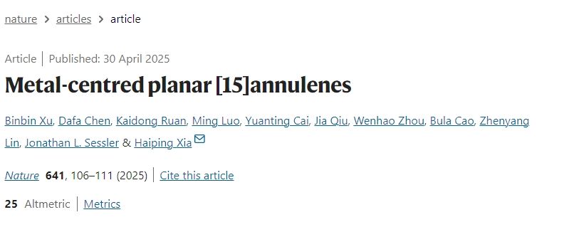 二茂铁的发现预示了现代有机金属化学的诞生。二茂铁及其类似物以一个或两个平面环烯阴离子与金属π配位为特征,是平面外环烯金属配合物的典型代表。相比之下,由于合成难度大以及具有适当内部尺寸的环烯非平面性,以及嵌入金属的困难,将金属整合到环烯核心中形成平面内环烯金属配合物受到了阻碍。这些挑战阻止了此类平面内环烯金属配合物的分离。南方HTH官网地址 大学化学系讲席教授、深圳格拉布斯研究院执行院长夏海平团队通过原创的合成策略,首次实现金属中心平面轮烯的构筑,揭示了金属-碳共轭的新机制,拓展了芳香化学、金属有机化学与材料科学的边界,并为跨学科研究提供了全新分子平台。其高稳定性和功能化潜力,预示了在催化、光电子器件等领域的应用前景。相关研究成果在4月30日以“Metal-centered planar [15]annulenes”为题发表于Nature。