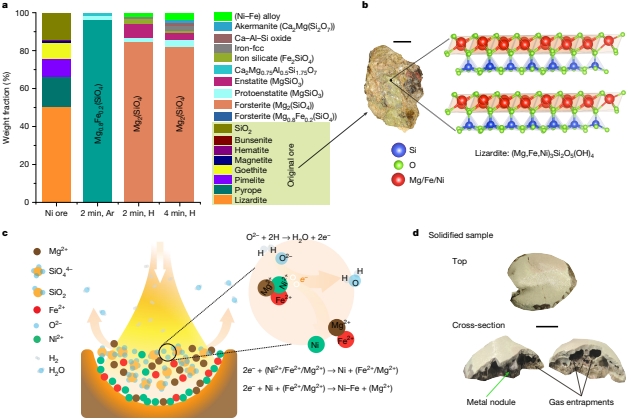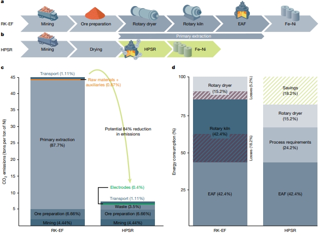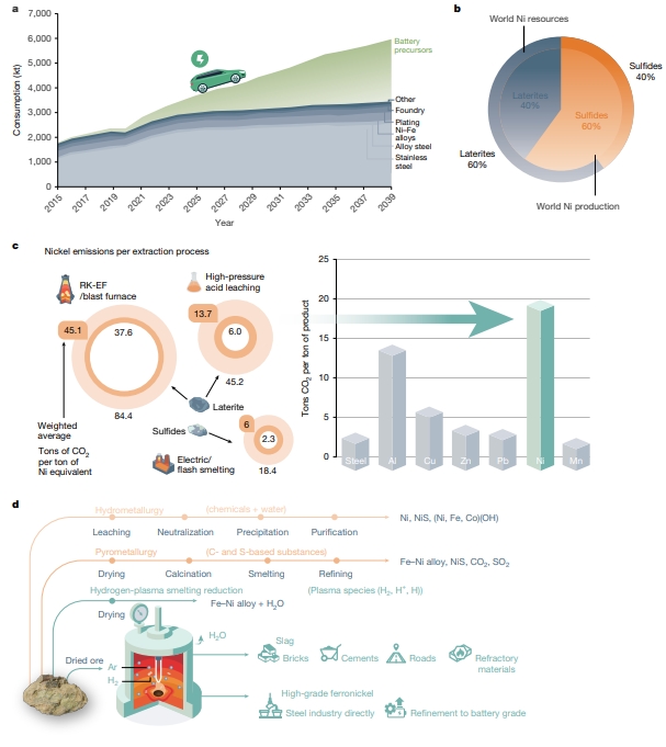 德国马普可持续材料研究所I. R. Souza Filho等人通过氢等离子体技术革新镍冶金流程,实现了选择性的镍还原,得到杂质极低(硅含量<0.04wt%,磷含量约0.01 wt%,钙含量<0.09wt%)的合金,无需进一步精炼。所提出的这种方法有望比现有做法提高约18%的能源效率,同时减少高达84%的直接二氧化碳排放。解决了传统工艺的高排放、高能耗与资源限制问题,为全球能源转型中镍的可持续供应提供了关键技术路径。研究成果以Sustainable nickel enabled by hydrogen-based reduction为题发表于Nature。