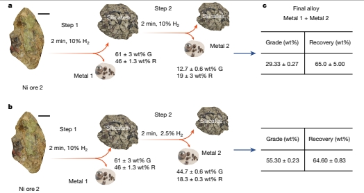 图4:Fe–Ni二元产品合金中Ni品位和回收率。
