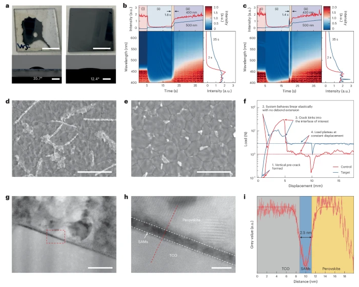 高密度SAMs减少基底(如ITO)与钙钛矿的直接接触,抑制载流子复合,提升了界面质量。紧密的SAMs层改善钙钛矿与基底的粘附力,抗剥离强度(Gc)从1.01 N(传统方法)提升至2.94 N,增强了机械稳定性。