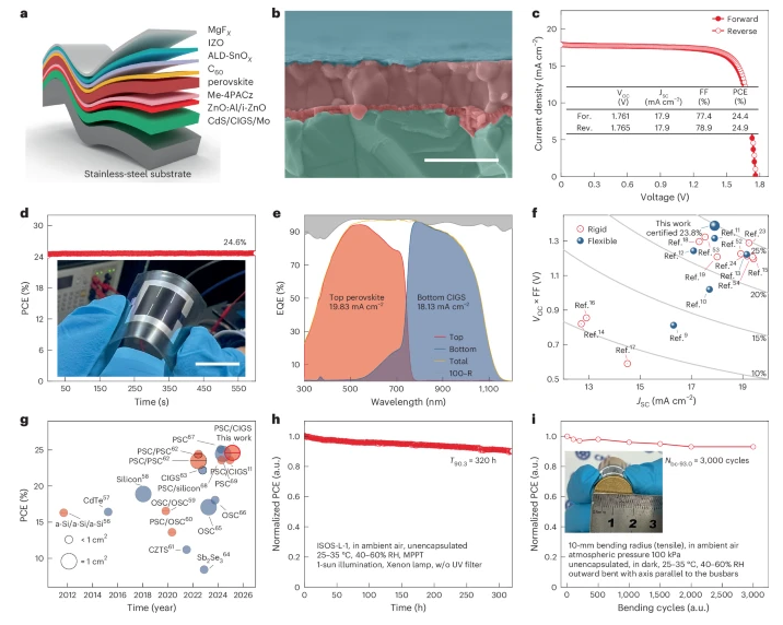 图5 柔性单片钙钛矿/CIGS叠层太阳能电池的性能。 ©2025 Springer Nature