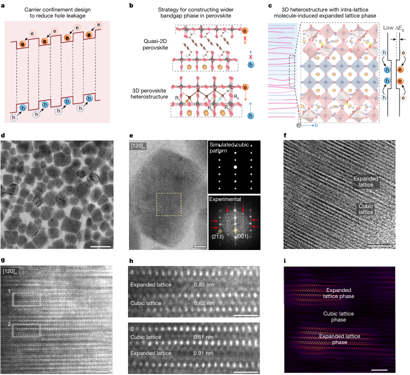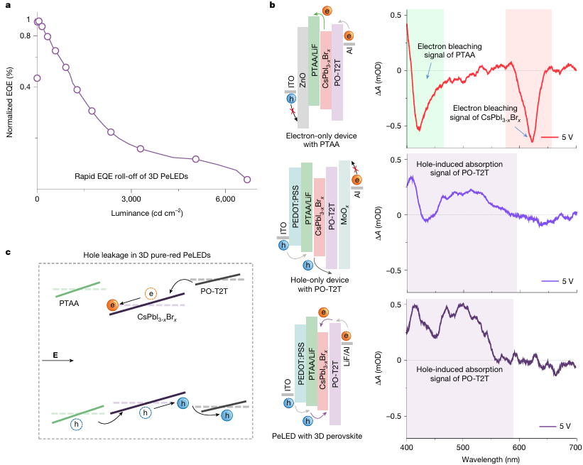 图3 晶内三维异质结构对抑制钙钛矿发光二极管(PeLEDs)中空穴泄漏的影响。© 2025 Nature