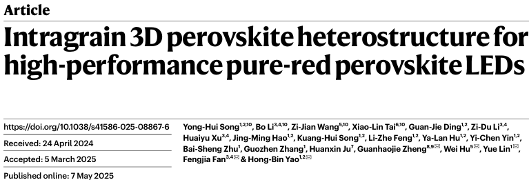 金属卤化物钙钛矿是有前途的下一代发光二极管(LED)发光体候选材料。在纯红色钙钛矿LED(PeLED)中同时实现高亮度和高效率是当前的一个目标。三维(3D)CsPbI3-xBrx发射体具有出色的载流子传输能力和高色彩纯度,这可以使纯红色PeLEDs实现高效和超高亮度。然而,这种设备容易出现效率下降,导致在高电流密度下效率和亮度较低。中国科学技术大学宋永慧(博士)、李波(博士后)、王子健(博士研究生)和台晓琳(博士研究生)为共同第一作者,中国科学技术大学姚宏斌教授、樊逢佳教授、林岳教授和胡伟教授为共同通讯作者,团队自主发明了电激发瞬态光谱(EETA)技术,并用该技术揭示出空穴泄漏是导致纯红三维钙钛矿LED效率滚降的关键因素,并开发出新型三维钙钛矿异质结发光层降低空穴泄漏(图1),成功制备出高性能纯红钙钛矿LED。相关研究成果以“Intragrain 3D perovskite heterostructure for high-performance pure-red perovskite LEDs”为题目发表在国际顶级期刊Nature上。