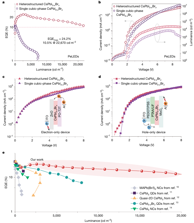 图1 . 三维立方相CsPbI3-xBrx基纯红色钙钛矿发光二极管(PeLEDs)的效率下降机制。© 2025 Nature