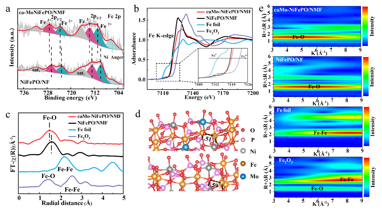 图2:在Fe 2p高分辨率XPS光谱中, caMo-NiFePO/NMF的Fe 2p 峰值向更高结合能偏移。结果表明Mo掺杂后使Fe朝着更高的价态转变,并且处于缺电子的状态,这有利于促进氧气析出反应。XANES 光谱表明Fe的k边能谱向更高的能量移动,表明caMo-NiFePO/NMF中Fe的价态更高,进一步证明了Mo调整了Fe的电子态,使其处于缺电子区状态。Mo掺杂引起的晶体结构畸变和非晶态结构,EXAFS和小波变换证明了caMo-NiFePO/NMF中的Fe-O键变短。