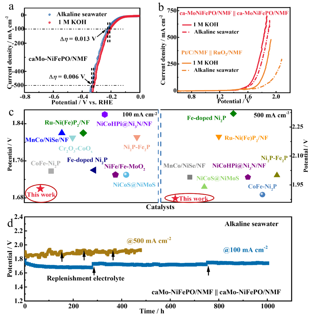 图6:caMo-NiFePO/NMF在碱性海水中具有和1 M KOH中相近的催化性能。其组装的整体海水电解槽仅需1.70 V即可达到100 mA cm-2,并能在100 mA cm-2下保持1000小时,在500 mA cm-2下保持480小时,表现出了优异的稳定性。