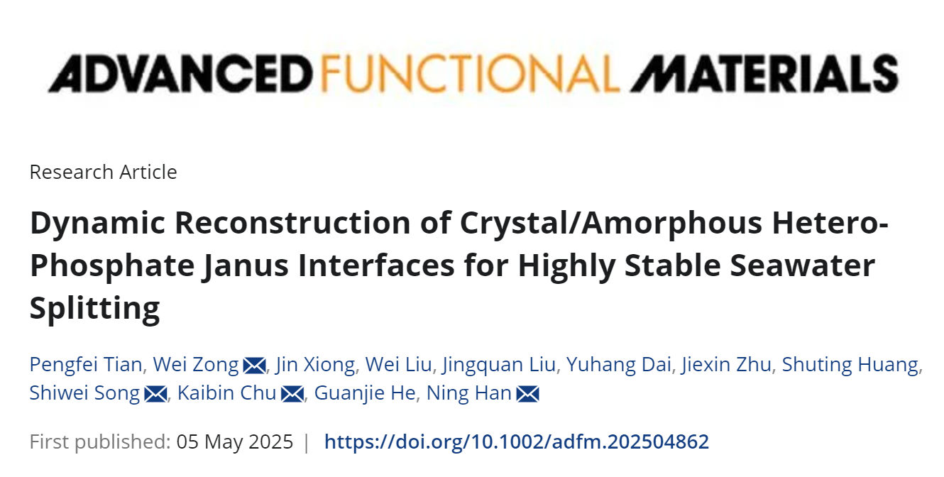 Pengfei Tian, Wei Zong, Jin Xiong, Wei Liu, Jingquan Liu, Yuhang Dai, Jiexin Zhu, Shuting Huang, Shiwei Song, Kaibin Chu, Guanjie He, Ning Han, Dynamic Reconstruction of Crystal/Amorphous Hetero-Phosphate Janus Interfaces for Highly Stable Seawater Splitting, Adv. Funct. Mater. 2025, 2504862. https://doi.org/10.1002/adfm.202504862